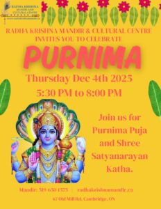 Join us for Purnima Puja and Shree Satyanarayan Katha. If you would like to do Puja please call or email us at rkmcc@radhakrishnamandir.ca